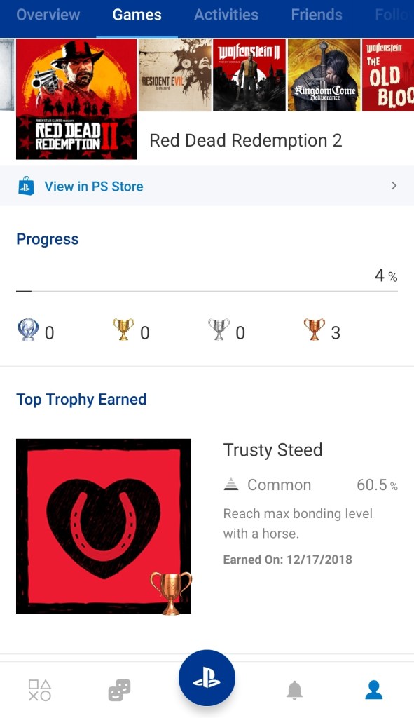 Sua lista de troféus está localizada na barra superior. Uma vez clicado, você pode ver informações sobre seus jogos jogados, bem como suas informações de troféus. Você pode ver a que horas você recebeu os troféus clicando neles.