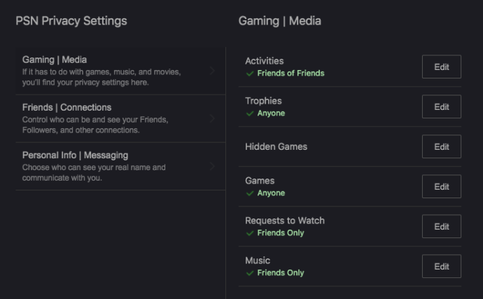 Para alterar quem pode ver suas atividades, troféus, lista de amigos, quais jogos você possui e muito mais, clique no botão Editar ao lado do que você deseja alterar.