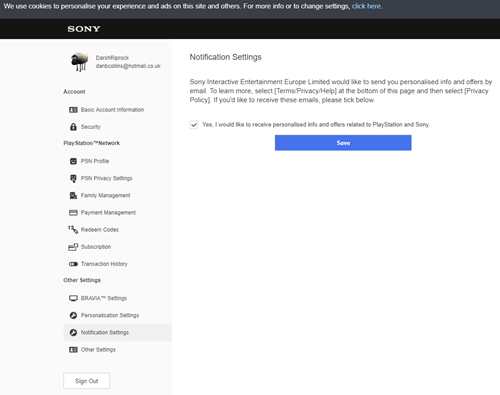 Acesse seu Conta Sony e faça login. Clique em Configurações de notificaçãoClique na caixa de seleçãoClique em Salvar botão
