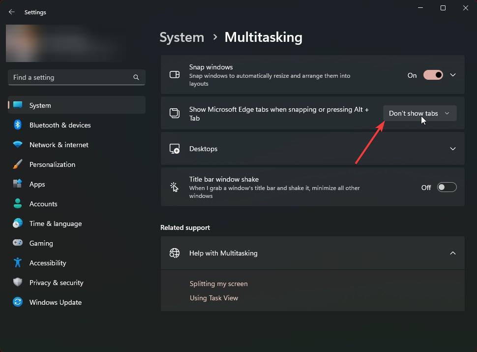 Selecione a opção a seguir na lista suspensa”Mostrar guias do Microsoft Edge ao encaixar ou pressionar Alt + Tab”.