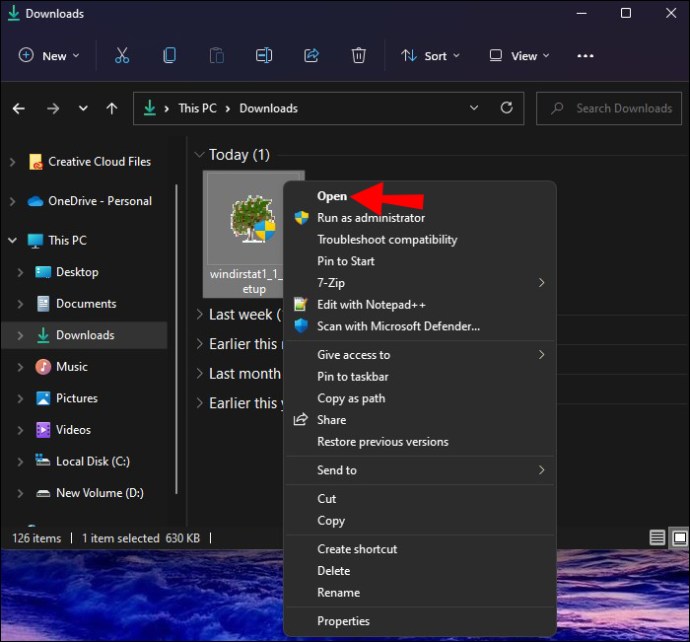 clique com o botão direito do mouse no ícone do programa WinDirStat e selecione”Executar como administrador”no menu pop-up.
