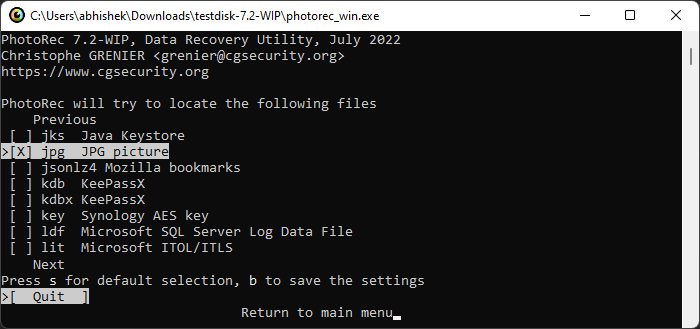 Se você deseja recuperar apenas suas fotos, entre em File Opt e pressione S para desativar todas as extensões. Em seguida, destaque os formatos de arquivo de imagem como jpg, png e assim por diante usando as teclas de seta e pressione espaço para selecioná-los. Eles mostrarão uma cruz se selecionados. Pressione Enter para salvar as alterações e voltar à tela anterior.