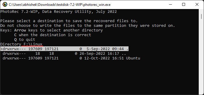 Você pode destacar uma pasta (veja o texto mais à direita para obter seu nome) e pressione a tecla Direita para entrar na pasta. Ou você pode pressionar a tecla Esquerda para retornar à pasta pai. Após selecionar (mais uma vez, marque ao lado do Diretório), pressione C para iniciar a recuperação.