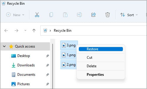Abra Executar pressionando Win + R.Enter shell:RecycleBinFolder para abrir a Lixeira.Procure as fotos que você precisa se recuperar. Você pode definir a visualização para ícones Grandes ou Médios para verificar as miniaturas. Clique com o botão direito do mouse nelas e selecione Restaurar.