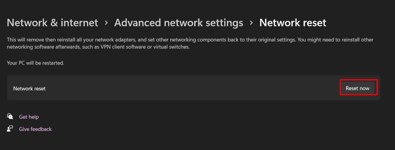 Vá para Rede e Internet nas configurações. Clique em Configurações de rede avançadas.SelecioneRedefinir rede. Pressione o botão Redefinir agora.