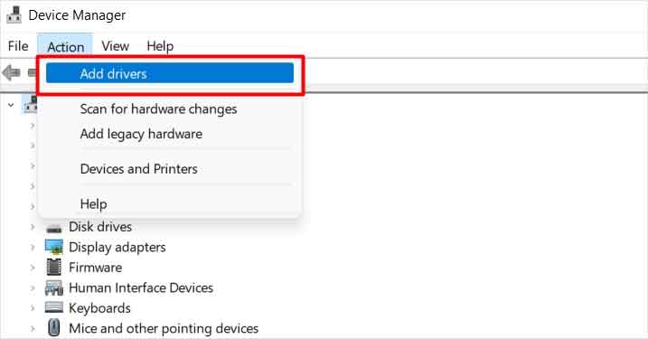 Aperte o botão Desinstalar no prompt.Agora, clique em Ação e vá com Adicionar drivers