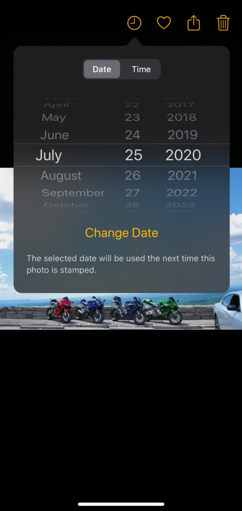 Tocar no ícone Texto permite adicionar o carimbo de data/hora, bem como personalizar o carimbo. Você pode querer brincar com algumas das opções para ver o que funciona melhor para suas fotos ou para compartilhá-las com outras pessoas! As opções de personalização podem incluir: