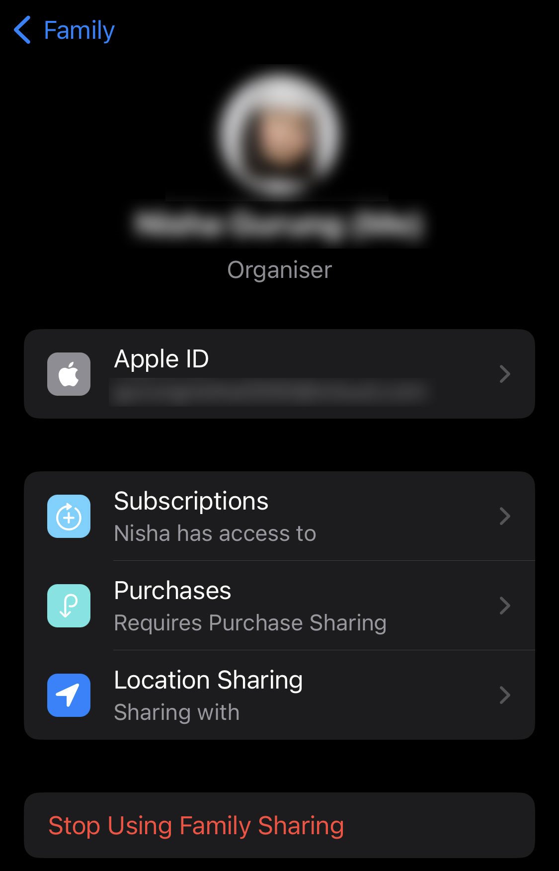 Toque na opção Parar de usar o Compartilhamento Familiar.