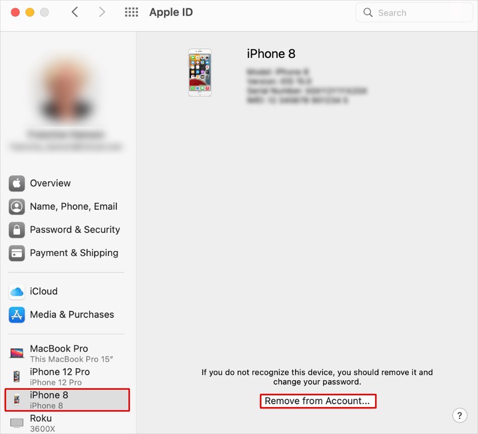 Na barra de menus, vá para Apple > Preferência do sistema Clique no seu ID Apple. Selecione seu iPhone na lista de dispositivos na barra lateral. Clique em Remover da conta para removê-la