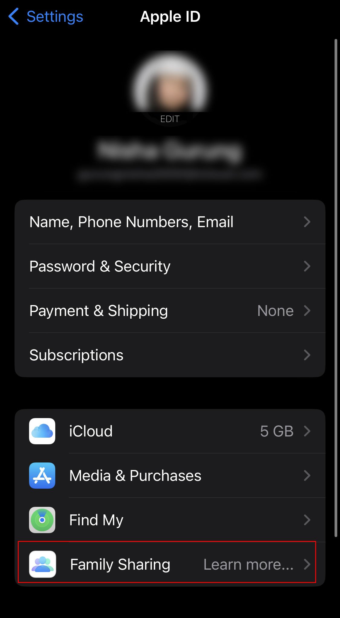 Outra parte do iPhone a ser limpa é o Compartilhamento Familiar. Se você estiver envolvido no grupo Compartilhamento Familiar, recomendamos deixá-lo e desativá-lo também. Aqui estão as etapas para se remover do grupo: