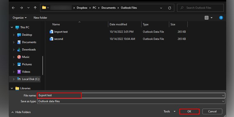 Depois, você pode verificar o caminho do arquivo que você digitou na etapa 8 para compartilhar ou usar o arquivo PST.