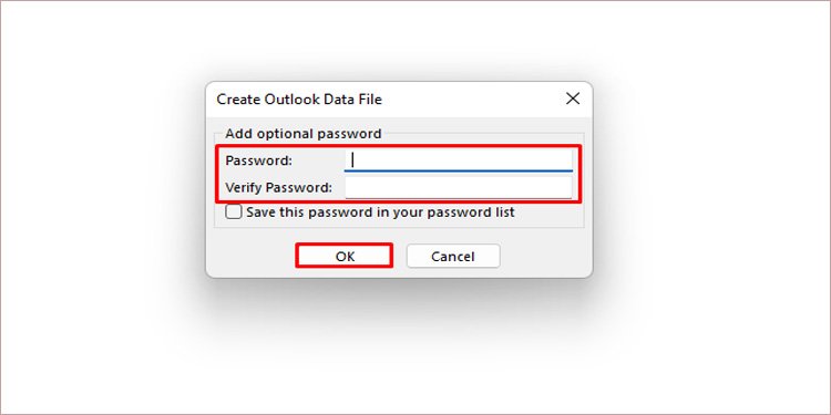 Insira e redigite uma senha para proteger seu arquivo PST com senha e clique em OK.