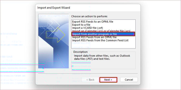 Selecione Importar de outro programa ou arquivo na janela pop-up e clique em Avançar.