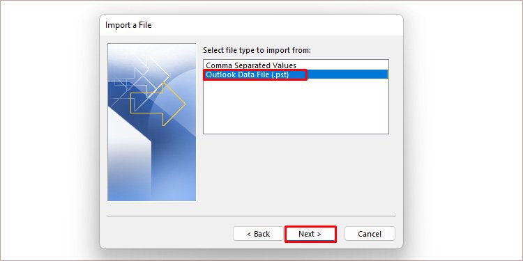 Selecione Arquivo de dados do Outlook (.pst) e clique em Avançar.