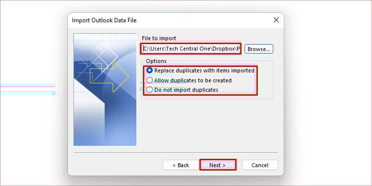 Navegue e clique duas vezes no arquivo.pst para importar. Digite a senha do arquivo.pst (se houver) e pressione Enter.