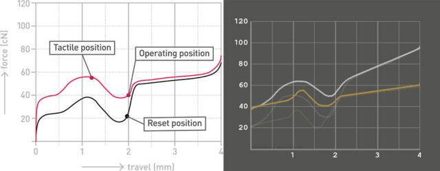 As curvas de força mostram quanto mais pesado o Clear padrão (direita) é comparado ao Ergo Clear (esquerda).