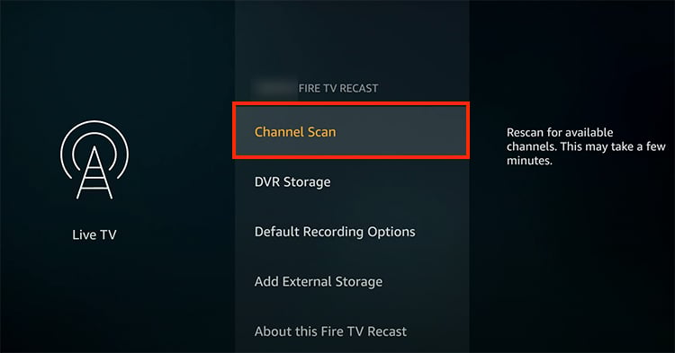 Toque em Configurações Escolha Configurações de reformulação do Fire TVToque em Gerenciamento de canaisSelecione Varredura de canais