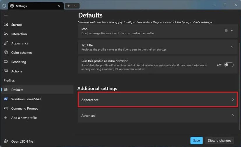 Na seção”Perfis”, escolha o perfil Padrões para aplicar as configurações a todos os perfis ou escolha um perfil específico, como Prompt de comando.