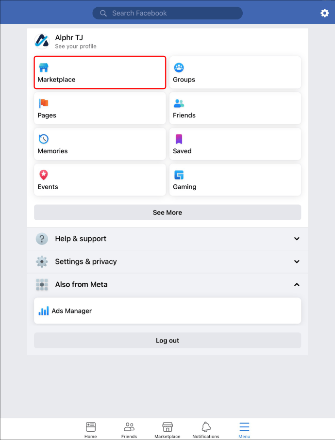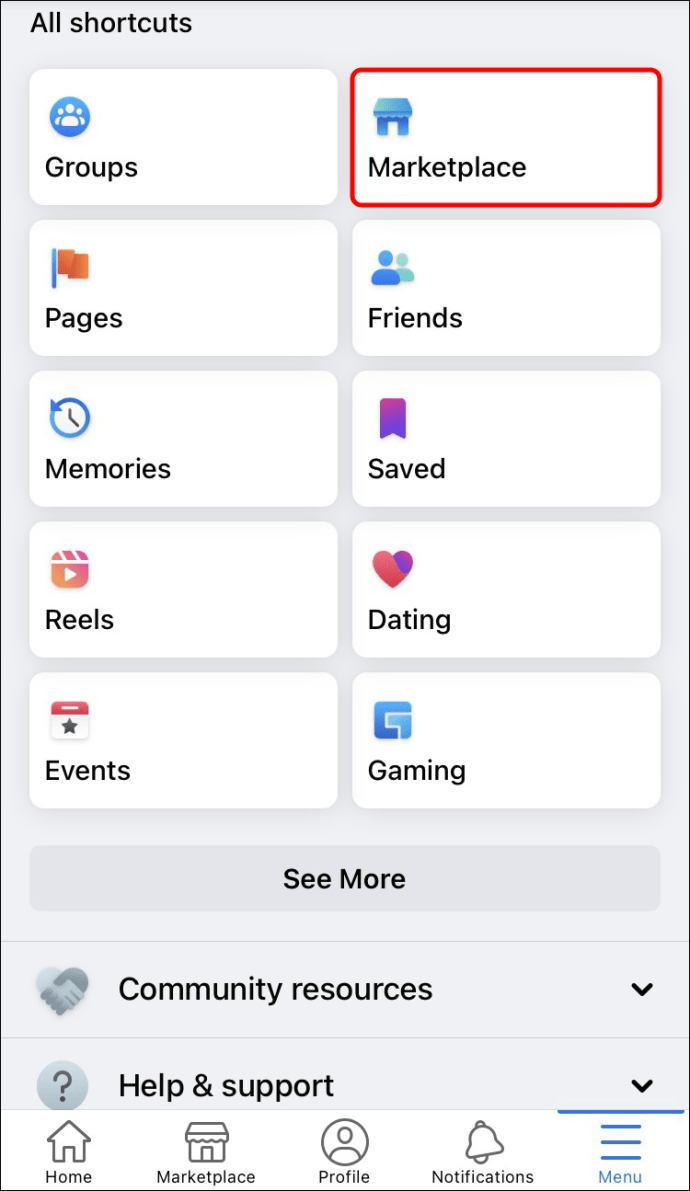 Rolar para baixo e toque em”Marketplace”. Se você não vir o Marketplace, toque em”Ver mais.”