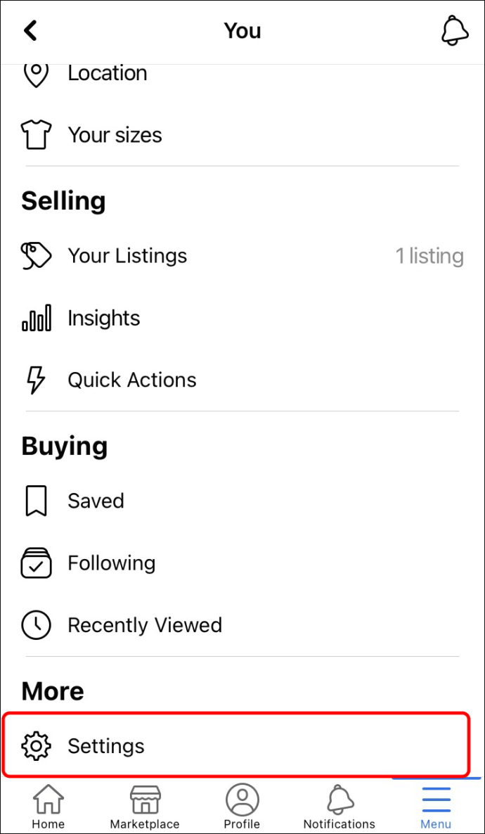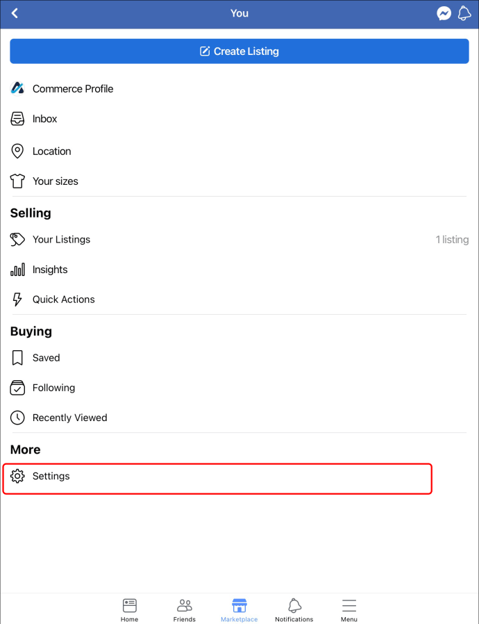 Quando estiver na seção Marketplace, toque no ícone humano na parte superior da tela e depois em”Configurações”.