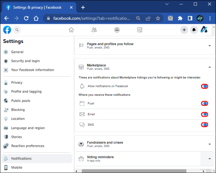 Finalmente, ao lado de cada tipo de notificação (por exemplo,”Push”), clique no botão de alternância para que ele diga”Ligado”. atividade relacionada ao Marketplace.