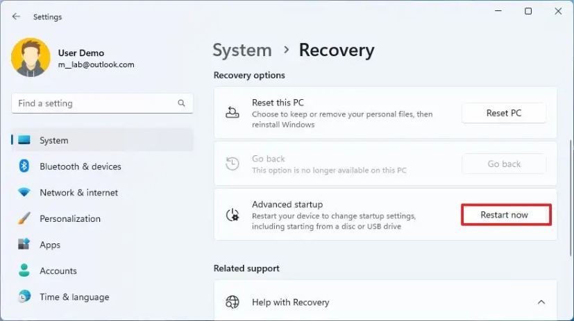 Na seção”Opções de recuperação”, clique no botão Reiniciar agora para a configuração”Inicialização avançada”.
