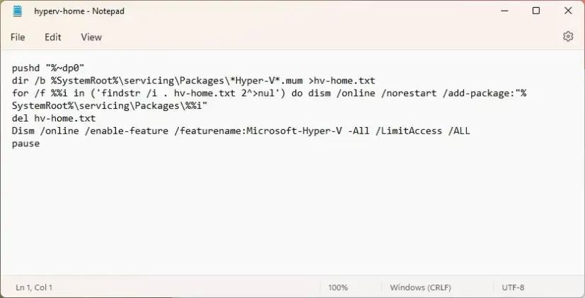 pushd”%~dp0″dir/b %SystemRoot%\servicing\Packages\*Hyper-V*.mum >hv-home.txt for/f %%i em (‘findstr/i. hv-home.txt 2^>nul’) faça dism/online/norestart/add-package:”%SystemRoot%\servicing\Packages\%%i”del hv-home.txt Dism/online/enable-feature/featurename:Microsoft-Hyper-V-All/LimitAccess/ALL pause