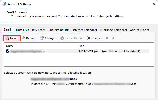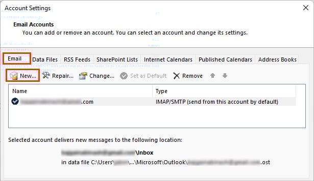 No prompt Configurações da conta, selecione a guia E-mail e c clique no botão Novo.