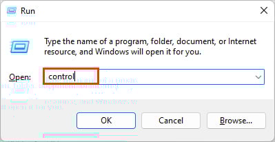 Pressione Windows + R para abrir o comando Executar. Em seguida, digite control e clique em OK para iniciar o painel de controle.