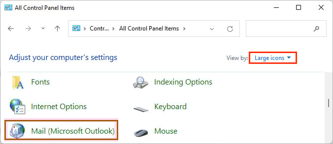 Escolha o valor de ícones grandes ao lado do campo View by no top-rig ht canto da janela.Agora, clique na opção Mail (Microsoft Outlook).
