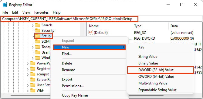Computador\HKEY_CURRENT_USER\Software\Microsoft\Office\16.0\Outlook\Setup