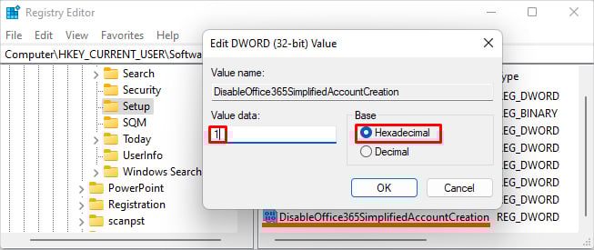 Renomeie o novo valor como DisableOffice365SimplifiedAccountCreation e clique duas vezes para abri-lo. No próximo prompt Editar valor DWORD (32 bits), defina os Dados do valor como 1. Além disso, certifique-se de escolher a base hexadecimal.