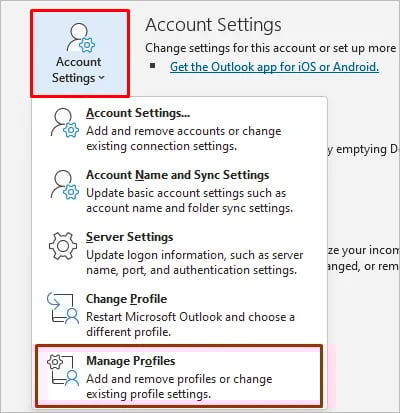 Inicie o aplicativo Outlook.Clique no menu Arquivo na barra superior.Em seguida, selecione a guia Informações.No painel direito , clique em Configurações da conta e escolha a opção Gerenciar perfis.