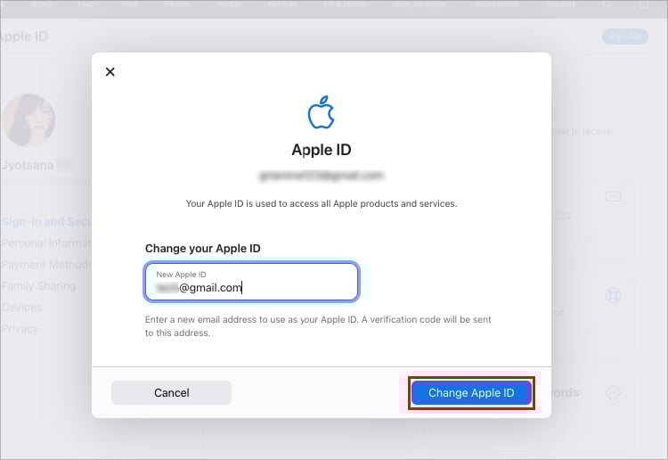 Digite seu ID de e-mail.Clique em Alterar ID Apple.