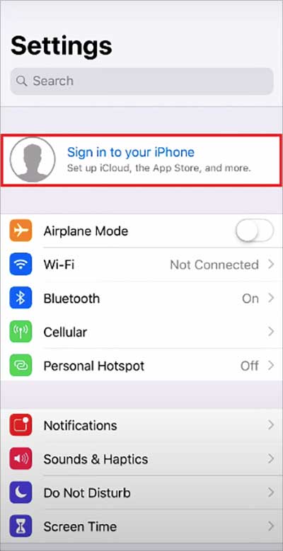 Vá para a configuração s app.Clique na opção Fazer login no seu iPhone na parte superior da tela.