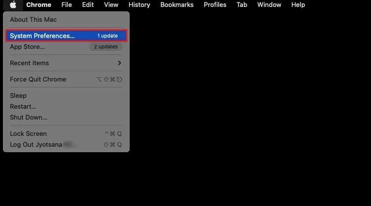 Clique no ícone da maçã na barra de menu superior.Selecione Preferências do Sistema.