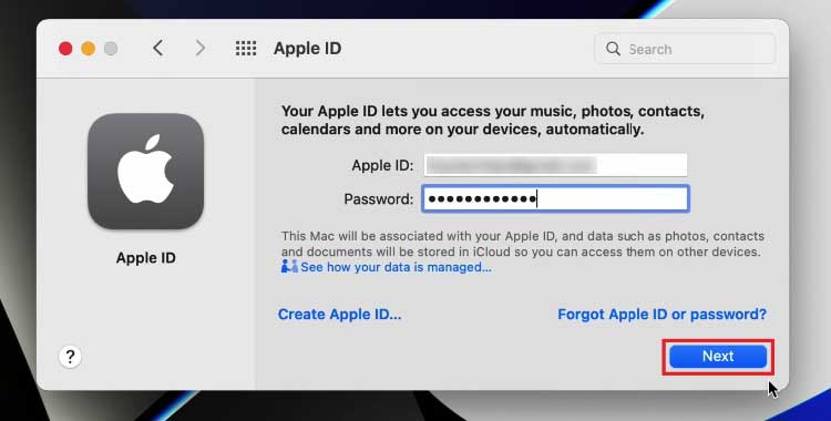 Aparece uma caixa de diálogo para fazer login com o ID Apple. Digite seu novo Apple ID e clique em Avançar.Digite sua nova senha e clique em Avançar.