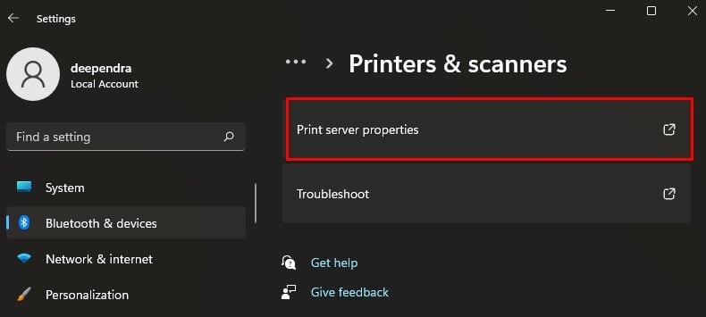 Abra Configurações no seu PC. Você pode fazer isso pressionando Windows + IO na página Configurações, escolha Bluetooth e dispositivos no painel esquerdo. Em seguida, escolha Impressoras e scanners na seção direita. Em Configurações relacionadas, clique em Propriedades do servidor de impressão.