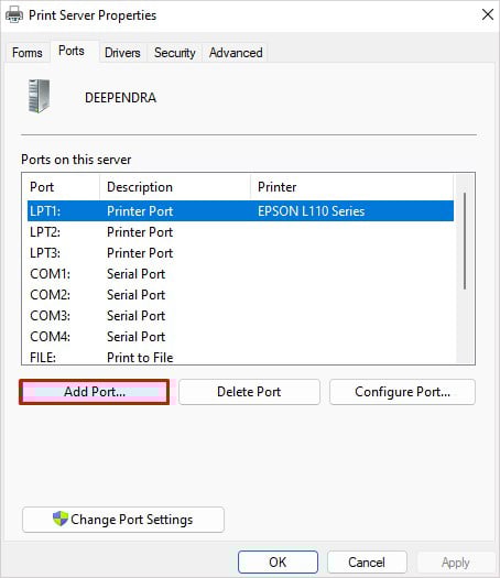 Na nova janela Propriedades do servidor de impressão, vá para a guia Portas. Selecione sua impressora e clique no botão Adicionar porta.