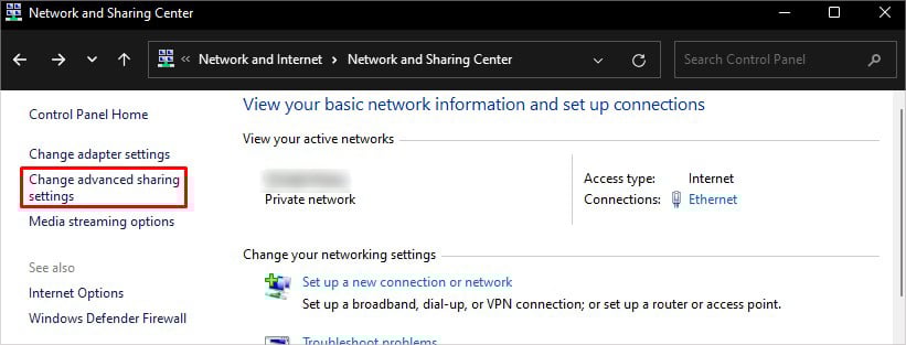 Pressione o controle Windows + RType no campo de texto. Em seguida, pressione a tecla Enter para abrir o Painel de Controle. Selecione Rede e Internet > Central de Rede e Compartilhamento. Escolha Alterar configurações de compartilhamento avançadas à esquerda.
