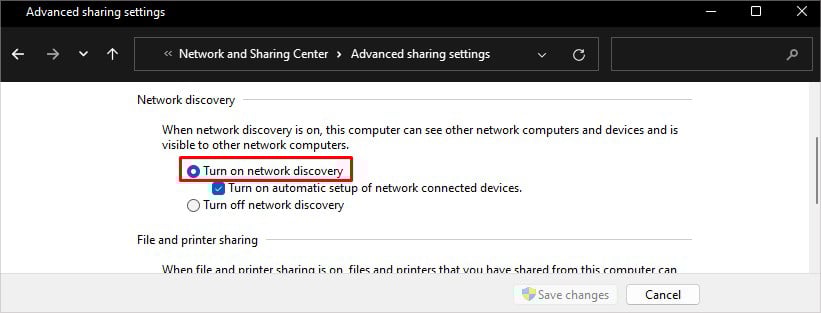 Quando a descoberta de rede está desativada, seu dispositivo não fica visível para outros dispositivos, nem você pode ver e adicionar outros dispositivos à rede. Portanto, você deve primeiro tornar seu PC visível na rede antes de poder usar a impressora sem fio.