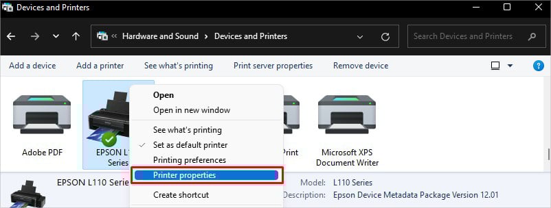 Inicie o Painel de controle no seu PC. Em seguida, navegue até Hardware e som > Dispositivos e impressoras.Na seção Impressoras , clique com o botão direito do mouse sobre sua impressora. Escolha Propriedades da impressora no menu de contexto.