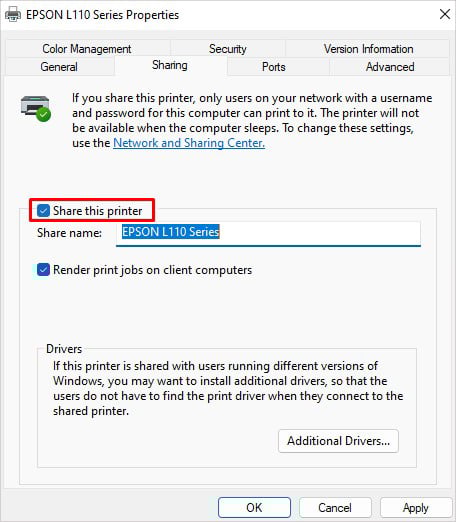 Na nova janela, vá para a guia Compartilhamento . Marque Compartilhe isso opção de impressora.