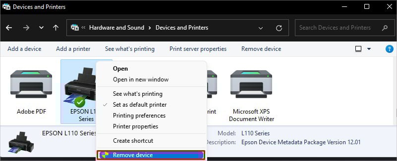 Pressione o controle Windows + RType e pressione Enter. Ele abrirá o Painel de Controle. No Painel de Controle, selecione Hardware e Som > Dispositivos e Impressoras. Clique com o botão direito do mouse sobre sua impressora sob o Menu Impressoras . Selecione Remover dispositivo.