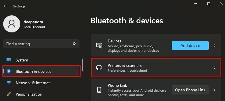 Clique em Sim no pop-up de confirmação.Depois de remover o perfil da impressora, agora é hora de adicioná-lo novamente.Clique em Windows + ICescolha Bluetooth e dispositivos menu.Em seguida, selecione Impressoras e scanners.