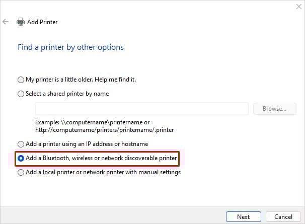 Na próxima janela, marque Adicionar uma impressora Bluetooth, sem fio ou detectável em rede e clique em Avançar.