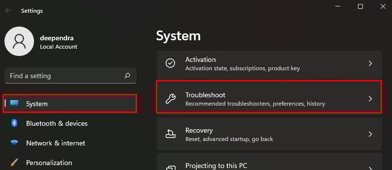 Pressione Windows + ICescolha o menu Sistema à esquerda. Em seguida, clique na opção Solucionar problemas na seção à direita.