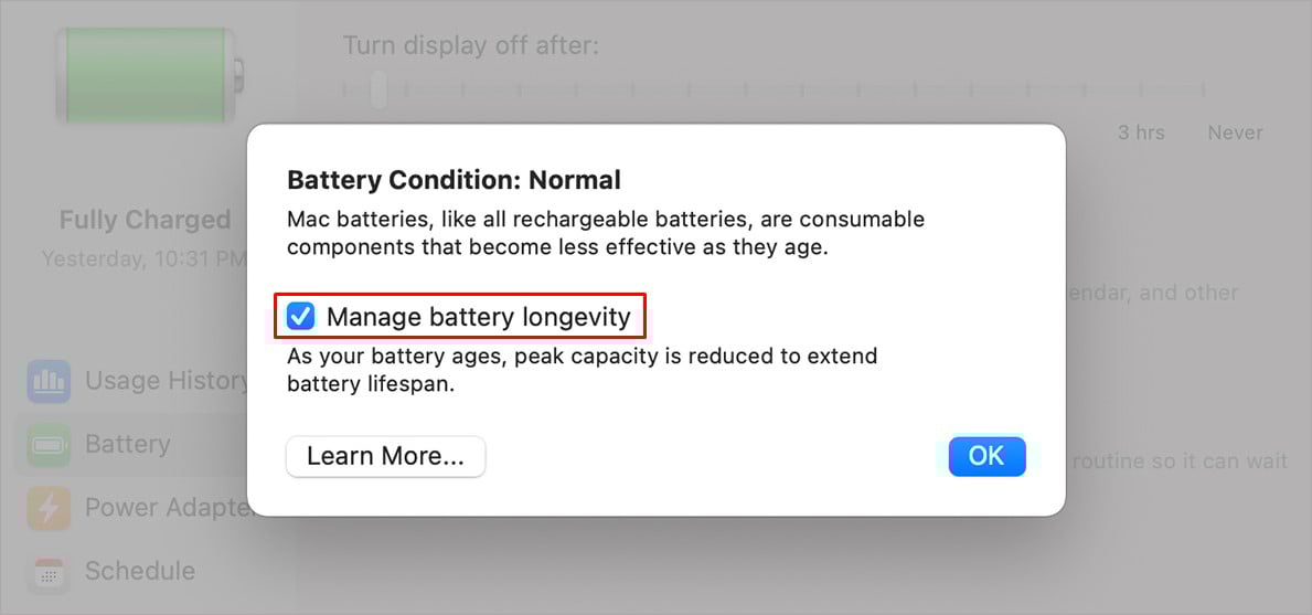 Na barra de menus, selecione Apple > Preferências do Sistema >.Escolha para ver as configurações de Bateria . Em seguida, selecione Bateria na barra lateral esquerda.Desmarque a opção para Gerenciar a longevidade da bateria.