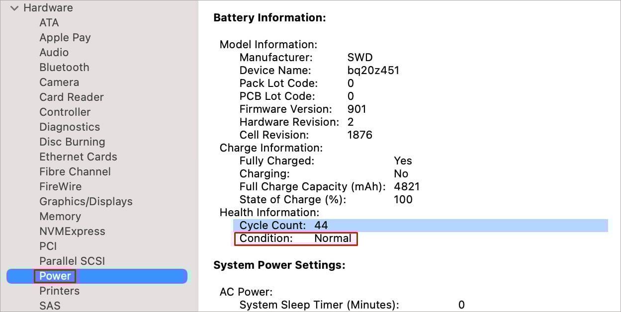 Segure Option e clique na barra Apple menu .Visualize as Informações do sistema.Extend Hardware na barra lateral.Clique em Energia. Em Informações da bateria, você verá a Condição atual em seu bateria.