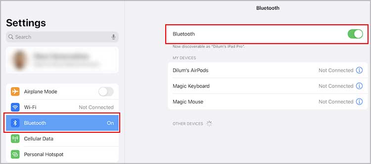 O Apple Pencil e o iPad estão conectados via Bluetooth. O problema de conectividade também pode ser a principal causa do problema. Você pode considerar reiniciar o Bluetooth do iPad nesse caso. Isso certamente pode ajudar seu iPad a identificar o lápis e se conectar a ele.